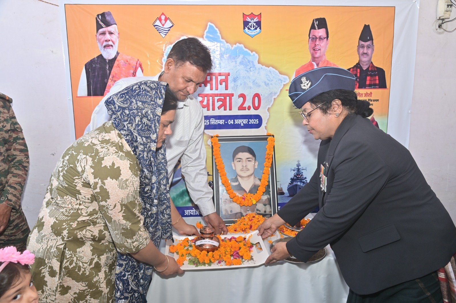 दिनांक 25 सितम्बर 2025 से 04 अक्टूबर 2025 तक किया जा रहा है। जनपद हरिद्वार के 02 शहीदों के घर-आंगन की मिट्टी संग्रह का कार्यक्रम दिनांक 03 अक्टूबर 2025 को जिला सैनिक कल्याण एव पुनर्वास कार्यालय, ज्वालापुर तहसील, हरिद्वार से प्रारम्भ किया गया। यात्रा शहीद हव० सोनित कुमार सैनी, जो दिनांक 11 अक्टूबर 2021 को अरुणांचल प्रदेश के ढुकुमपानी क्षेत्र में शहीद हुए थे, के ग्राम धनौरा, ब्लाक-रूड़की में पुहंची। समस्त ग्रामवासियों द्वारा शहीद सैनिक को श्रृद्धांजलि के पश्चात शहीद सैनिक की पत्नी श्रीमती गीता सैनी द्वारा घर-आंगन की मिटट्टी का ताम्र कलश जिला सैनिक कल्याण अधिकारी को हस्तगत किया गया।