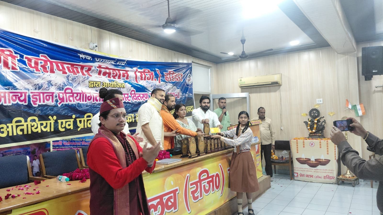 हरिद्वार।आज देववाणी परोपकार मिशन हरिद्वार द्वारा 11 वां सामान्य ज्ञान प्रतियोगिता 2025 ,26 प्रेस क्लब हरिद्वार में पुरस्कार वितरण किया गया देववाणी परोपकार मिशन के अध्यक्ष ईश्वर सुयाल ने बताया कि सामान्य ज्ञान प्रतियोगिता में प्रथम द्वितीय तृतीय छात्र-छात्राओं को नगद पुरस्कार एवं शील्ड प्रमाण पत्र देकर सम्मानित किया गया जिसमें प्रथम स्थान आलोक पांडे वेद विद्यार्थी देहरादून जया रेडियंट पब्लिक स्कूल द्वितीय स्थान प्राची भारद्वाज सिवा नेशनल स्कूल भव्य कानेकर ,साध्वी आनंद ज्योति स्कूल ने संयुक्त रूप से तृतीय स्थान राशि अग्रवाल चेतन ज्योति जूनियर हाई स्कूल ,सारांश कौशिक भागीरथी विद्यालय हरिपुर ने संयुक्त रूप से प्राप्त किया प्रतिभागियों को संयुक्त रूप से क्रमशः 5100,₹2100 और ₹1100 नगद पुरस्कार प्रदान किया गया इसके साथ ही हिमालयन अकैडमी हिमांगी, अंशिका , दून पब्लिक स्कूल के गुंजन सिंह, गिरीश चंद्र रवाली, हरि भारती संस्कृत विद्यालय में राहुल भट्ट ,सरोज ,आयुष गॉड शिव नेशनल स्कूल से स्नेहा गुप्ता ,प्राची भारद्वाज आयुषी जोशी सप्त ऋषि संस्कृत विद्यालय से रवि पांडे ,रोशन कुमार दुबे भागीरथी विद्यालय सार्थक राणा को मंच पर शील्ड प्रमाण पत्र देकर सम्मानित किया गया इस मौके पर कार्यक्रम में मुख्य अतिथि हरिद्वार नगर निगम महापौर श्रीमती किरण जैसल ने कहा कि छात्र-छात्राओं में स्कूली ज्ञान के साथ-साथ सामान्य ज्ञान होना बहुत जरूरी है इससे छात्रों को एक मंच मिलता है और अपनी प्रतिभा साबित करने का अवसर होता है जो आने वाले प्रतियोगी परीक्षाओं में उनके लिए मील का पत्थर साबित होगी उन्होंने ऐसे आयोजन पर देववाणी परोपकार मिशन को शुभकामनाएं दी गरीब दासी आश्रम के अध्यक्ष स्वामी रवि देव शास्त्री ने कहा कि हिंदी संस्कृत सामान्य ज्ञान प्रतियोगिता से छात्र-छात्राओं में प्रतिस्पर्धा का मार्ग खुलता है छात्रों को अध्ययन अध्यापन के साथ सामान्य ज्ञान बहुत जरूरी है आज के इस भौतिक आधुनिक युग में पूरे विश्व भर की खबरें हर किसी को पता होना चाहिए इस मौके पर युवा भारत साधु समाज के राष्ट्रीय अध्यक्ष शिवम महंत ने कहा कि संस्कृत हिंदी सामान्य ज्ञान प्रतियोगिता बहुत ही उपयोगी है जहां छात्रों को संस्कृत और हिंदी अंग्रेजी सभी माध्यमों के छात्रों को एकजुट होकर परीक्षाएं देनी हो रही हैं इस अवसर पर कार्यक्रम अध्यक्ष ईश्वर सुयाल ने सभी का अभिनंदन स्वागत किया इस मौके पर विनय यादव मोहित जोशी नवीन सुयाल राहुल भट्ट स्नेहा गुप्ता राजवीर सिंह मुकेश सैनी प्रदीप कुमार कमल किशोर प्राची देवी गुंजन सिंह आयुषी जोशी आदि उपस्थित रहे