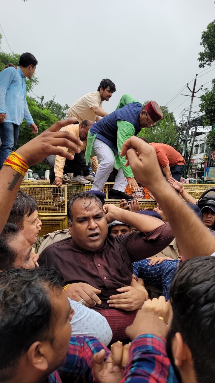 देहरादून। भारतीय जनता पार्टी महानगर देहरादून के सम्मानित अध्यक्ष श्री सिद्धार्थ अग्रवाल के नेतृत्व में राजपुर रोड देहरादून स्थित कांग्रेस भवन का घेराव किया गया। इस प्रदर्शन का मुख्य उद्देश्य कांग्रेस नेताओ द्वारा माननीय प्रधानमंत्री श्री नरेन्द्र मोदी जी की आदरणीय स्वर्गीय माता जी के प्रति की गई अमर्यादित एवं अपमानजनक टिप्पणी के विरोध को दर्ज कराना था।