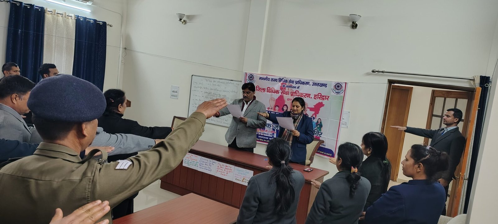 हरिद्वार। राष्ट्रीय मतदाता दिवस पर जिला विधिक सेवा प्राधिकरण के सभागार में आयोजित शपथ ग्रहण समारोह में जनपद न्यायाधीश नरेंद्र दत्त ने न्यायिक अधिकारीयों एवं कर्मचारियों को शपथ दिलाई गई ।