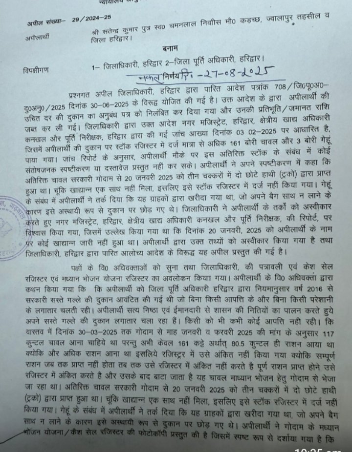 जिलाधिकारी, हरिद्वार द्वारा पारित आदेश पत्रांक 708/जि०पू०अ०-दु०अनु०/2025 दिनांक 30-06-2025 के विरुद्ध योजित की गई है। उक्त आदेश के द्वारा अपीलार्थी की उचित दर की दुकान का अनुबंध पत्र को निलंबित कर दिया गया और उनकी प्रतिभूति / जमानत राशि जब्त कर ली गई। जिलाधिकारी द्वारा उक्त आदेश नगर मजिस्ट्रेट, हरिद्वार, क्षेत्रीय खाद्य अधिकारी कनखल और पूर्ति निरीक्षक, हरिद्वार द्वारा की गई जांच आख्या दिनांक 03 02-2025 पर आधारित है, जिसमें अपीलार्थी की दुकान पर स्टॉक रजिस्टर में दर्ज मात्रा से अधिक 161 बोरी चावल और 3 बोरी गेहूं पाया गया। जांच रिपोर्ट के अनुसार, अपीलार्थी मौके पर इस अतिरिक्त स्टॉक के संबंध में कोई संतोषजनक स्पष्टीकरण या दस्तावेज प्रस्तुत नहीं कर सके। अपीलार्थी ने अपने स्पष्टीकरण में कहा कि अतिरिक्त चावल सरकारी गोदाम से 20 जनवरी 2025 को तीन चक्करों में दो छोटे हाथी (ट्रको) द्वारा प्राप्त हुआ था। चूंकि खाद्यान्न एक साथ नहीं मिला, इसलिए इसे स्टॉक रजिस्टर में दर्ज नहीं किया गया। गेहूं के संबंध में अपीलार्थी ने तर्क दिया कि यह ग्राहकों द्वारा खरीदा गया था, जो अपने बैग साथ न लाने के कारण इसे अस्थायी रूप से दुकान पर छोड़ गए थे। जिलाधिकारी ने अपीलार्थी के तर्कों को अस्वीकार करते हुए नगर मजिस्ट्रेट, हरिद्वार क्षेत्रीय खाद्य अधिकारी कनखल और पर्ति निरीक्षक की रिपोर्ट पर विश्वास किया गया, जिसमें उल्लेख किया गया था कि दिनांक 20 जनवरी, 2025 को अपीलार्थी के नाम पर कोई खाद्यान्न जारी नहीं हुआ था। अपीलार्थी द्वारा उक्त तथ्यों को अस्वीकार किया गया है तथा जिलाधिकारी, हरिद्वार द्वारा पारित आलोच्य आदेश के विरूद्ध यह अपील प्रस्तुत की गई है।